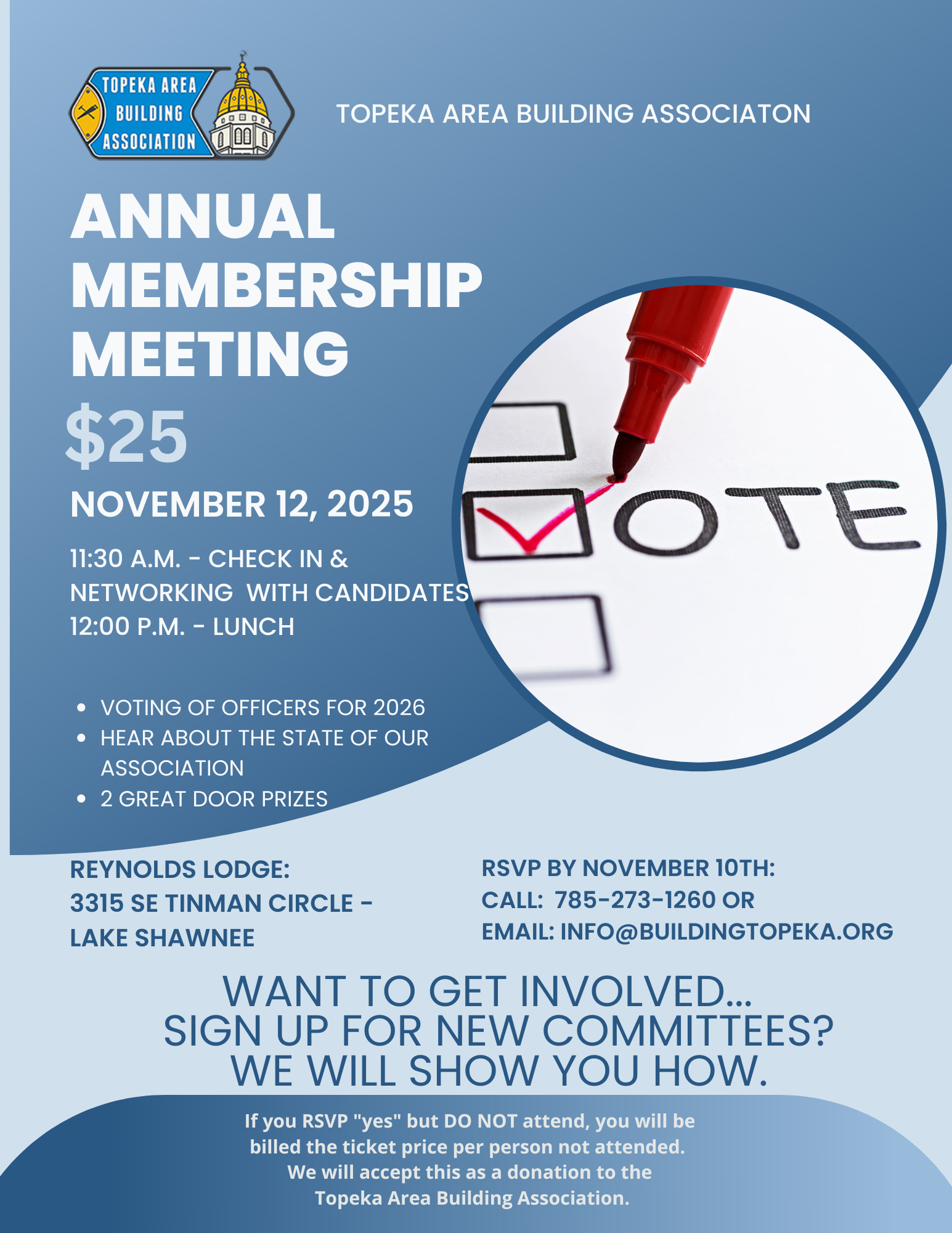 Here’s what’s happening: ✅ Vote for 2026 Officers 📣 Hear the State of the Association 🤝 Network with Fellow Members 🎁 Win Fun Door Prizes 💡 Learn How to Get Involved or Join/ Sign up for a Committee