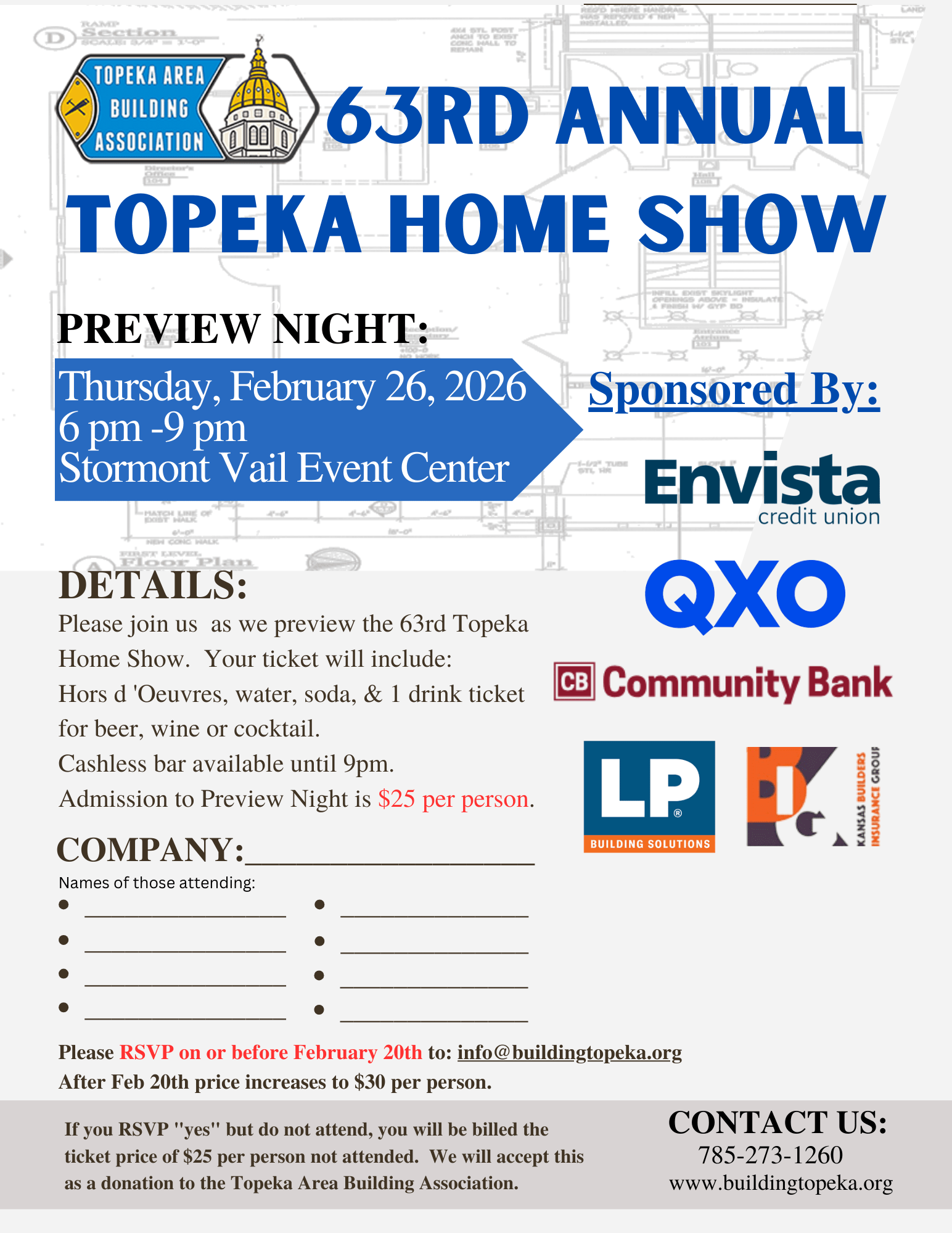 If you RSVP "yes" but do not attend, you will be billed the ticket price of $25 per person attended. We will accept this as a donation to the Topeka Area Building Association.